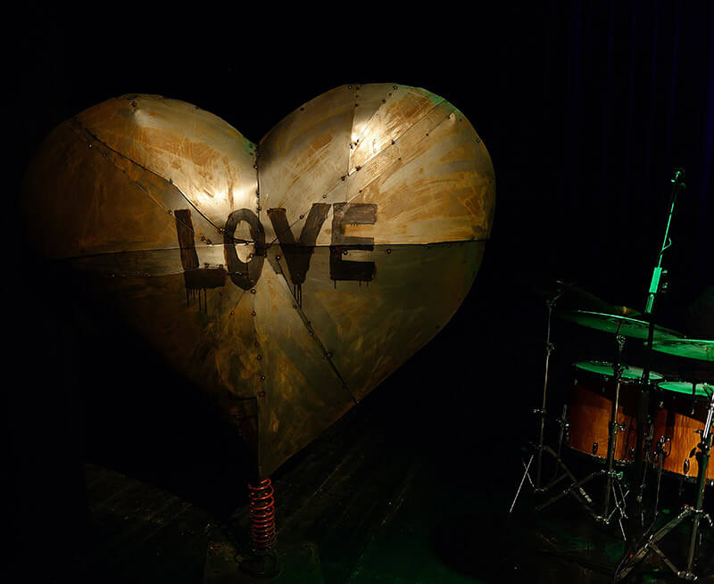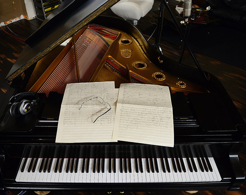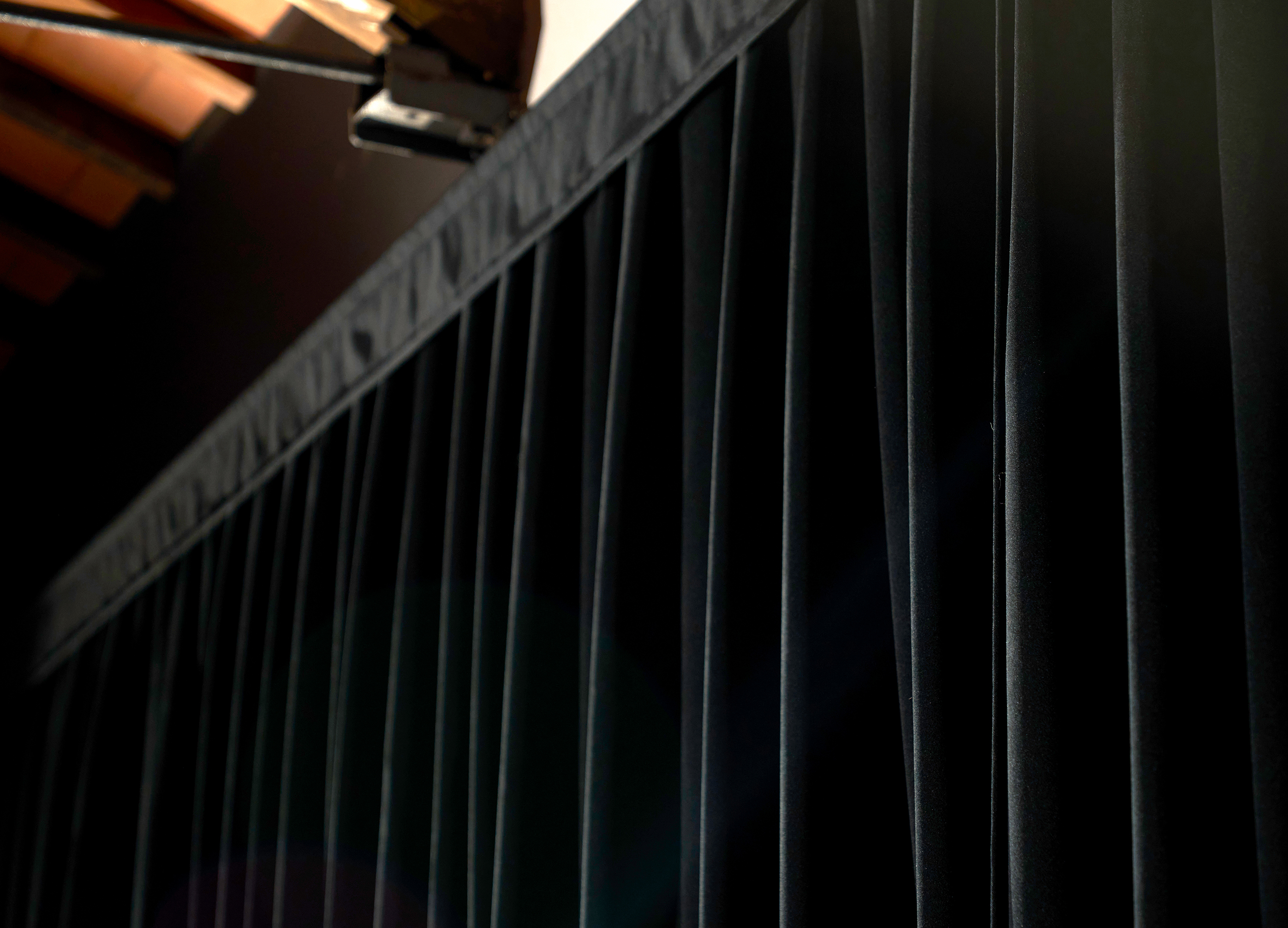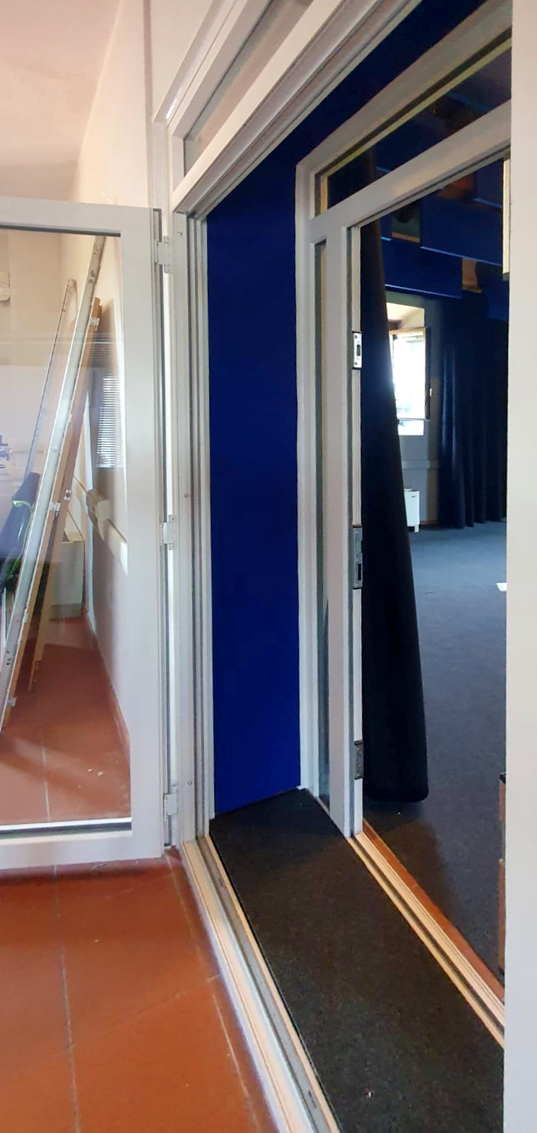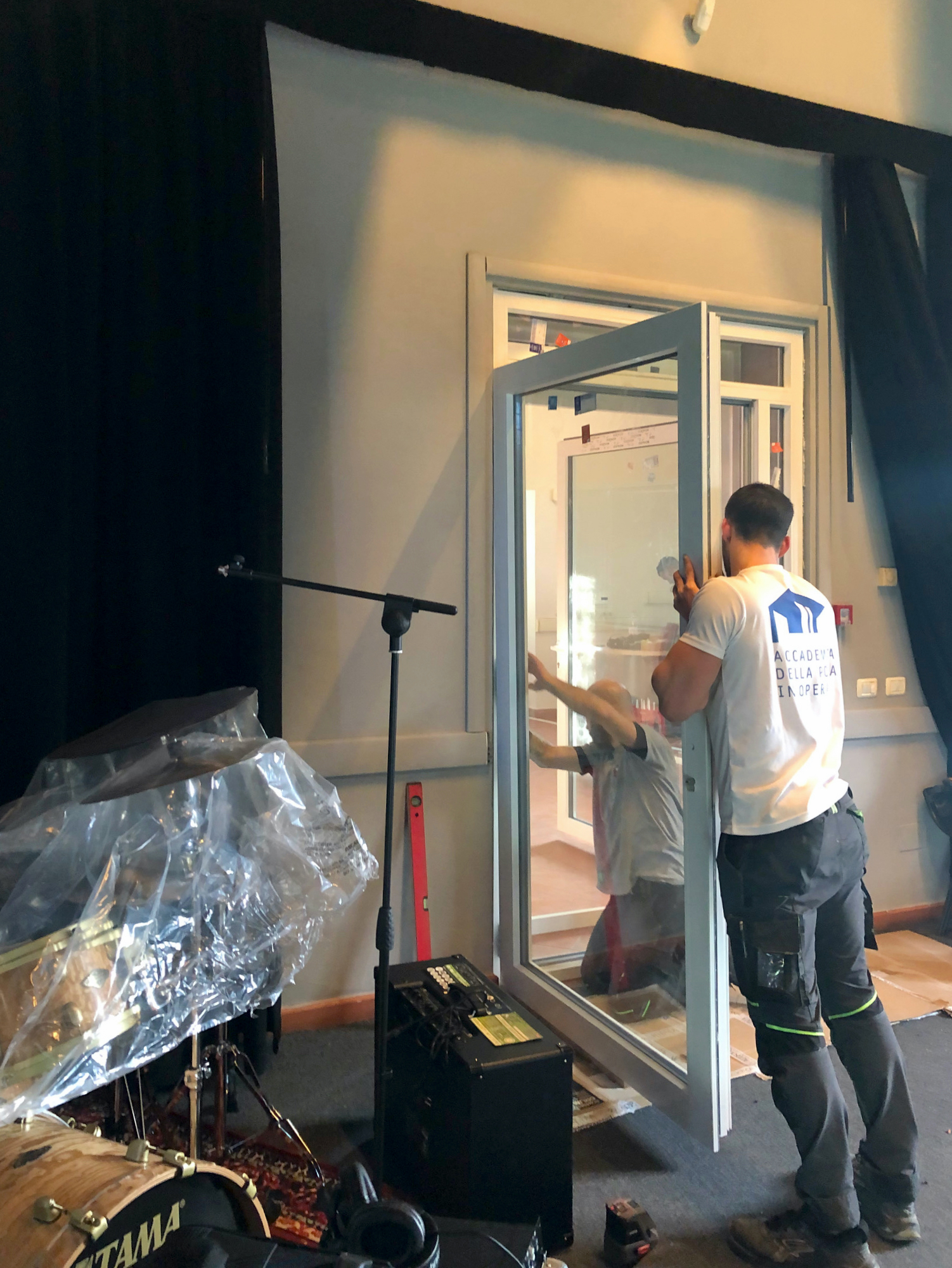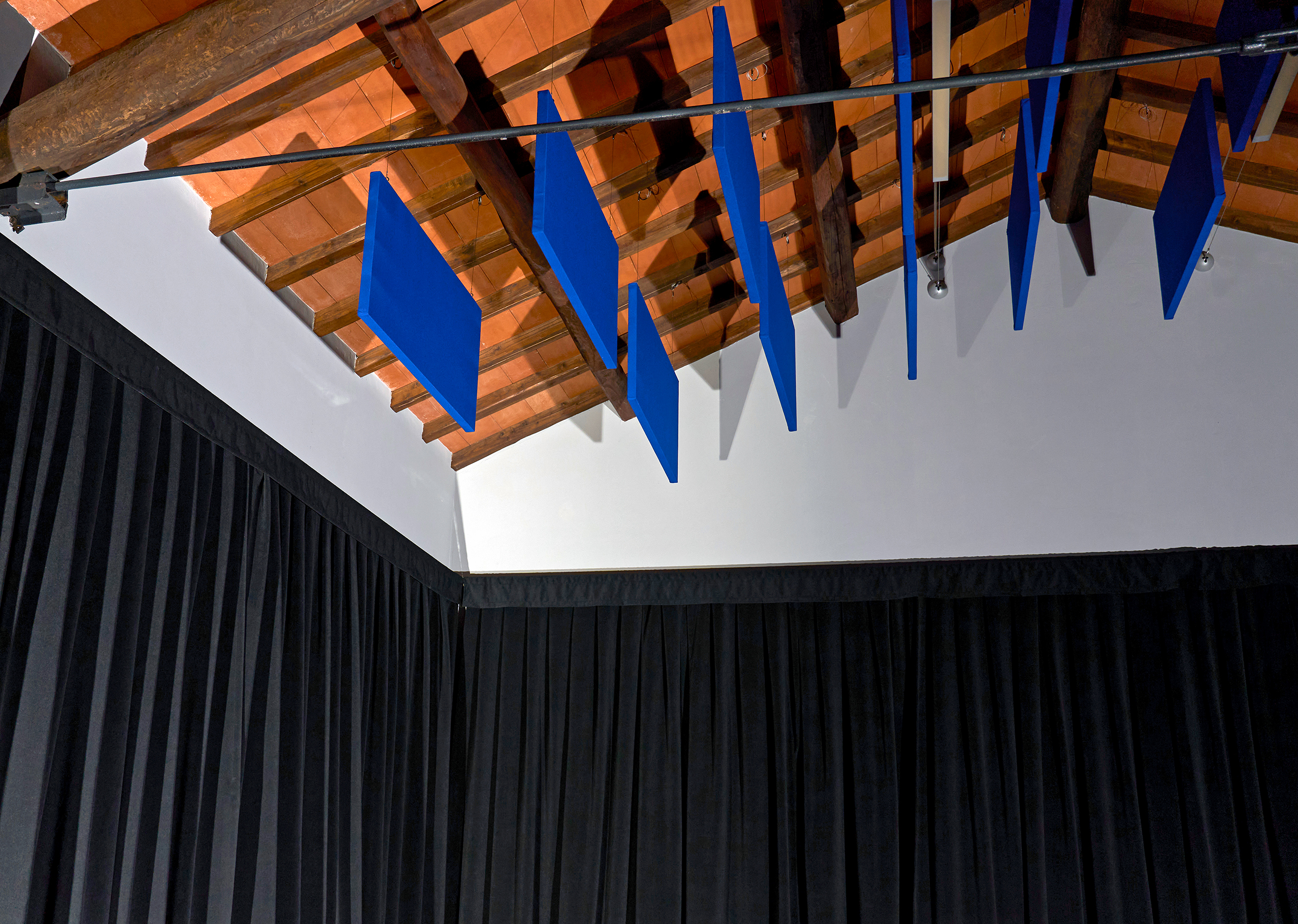 Allestimento-trattamento acustico fonoassorbente con porte fonoimpedenti per una grande sala di ripresa (tendaggio perimetrale in tessuto di velluto nero